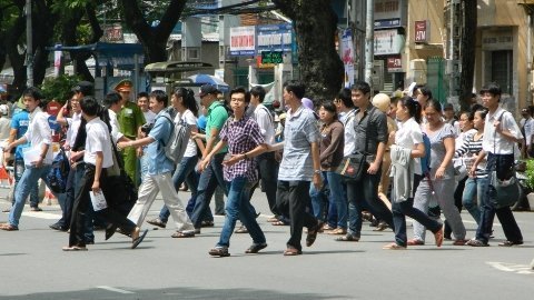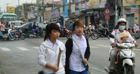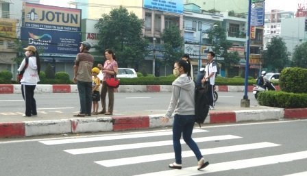 | 2 nữ sinh khác do lo sợ làn xe dày đặc đã đi bộ dọc xuống một đoạn rất dài để tìm chỗ vạch sơn trắng qua đường dành cho người đi bộ ở ngã tư đèn đỏ. |
