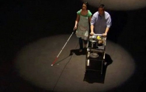 | Bước vào trường quay với sự hỗ trợ của chồng và cây gậy dò đường |