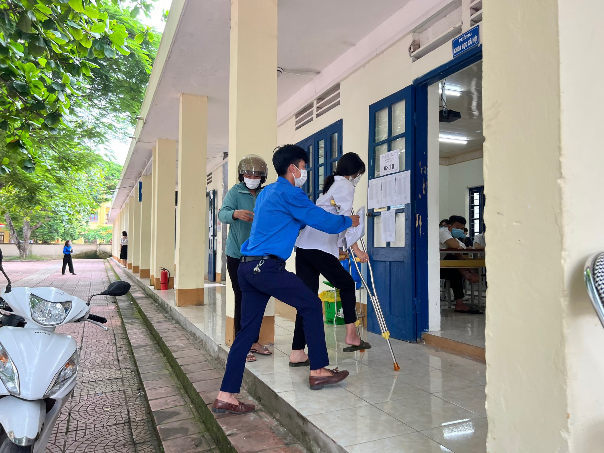 Trong ngày đầu của kỳ thi tốt nghiệp THPT năm 2022, tại Quảng Ninh có nhiều thí sinh đang phải điều trị ở bệnh viện hoặc ở nhà do bị tai nạn. Đa số phải ngồi xe lăn, chống nạng và được người thân đưa tới điểm thi. Khi tới cổng trường đều được đội ngũ tình nguyện viên cùng thầy cô hỗ trợ tận tình để di chuyển tới phòng thi.