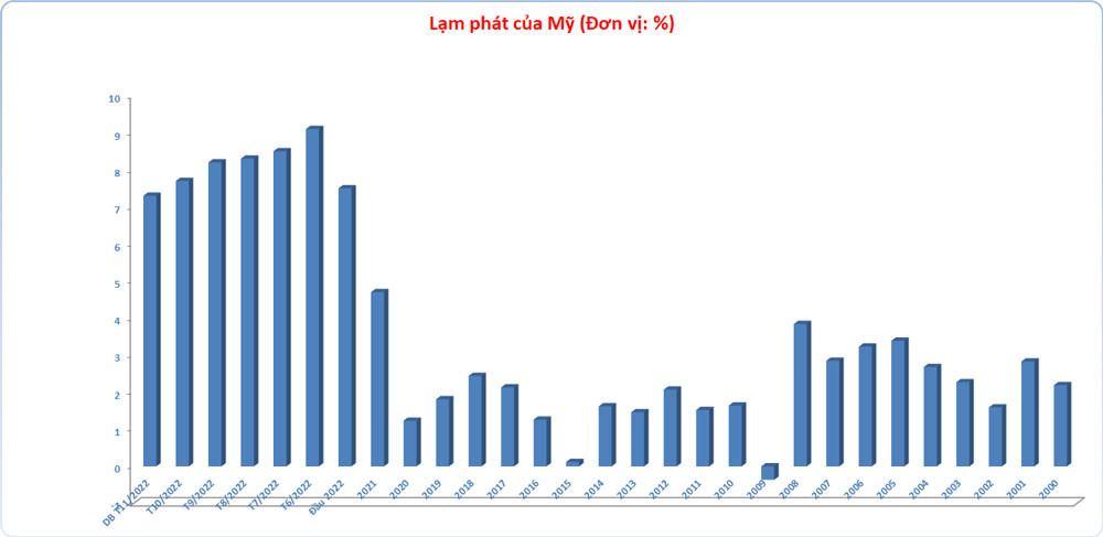 Các tổ chức lớn có dự báo trung bình lạm phát Mỹ ở mức 7,3% (Bloomberg dự báo 7,2%, Citi 7,2%, JP Morgan 7,3%, Scotiabank 7,4%...). Trong tháng 10, lạm phát Mỹ đứng ở mức 7,7% (so với cùng kỳ) và con số hồi tháng 6/2022 là 9,1%.