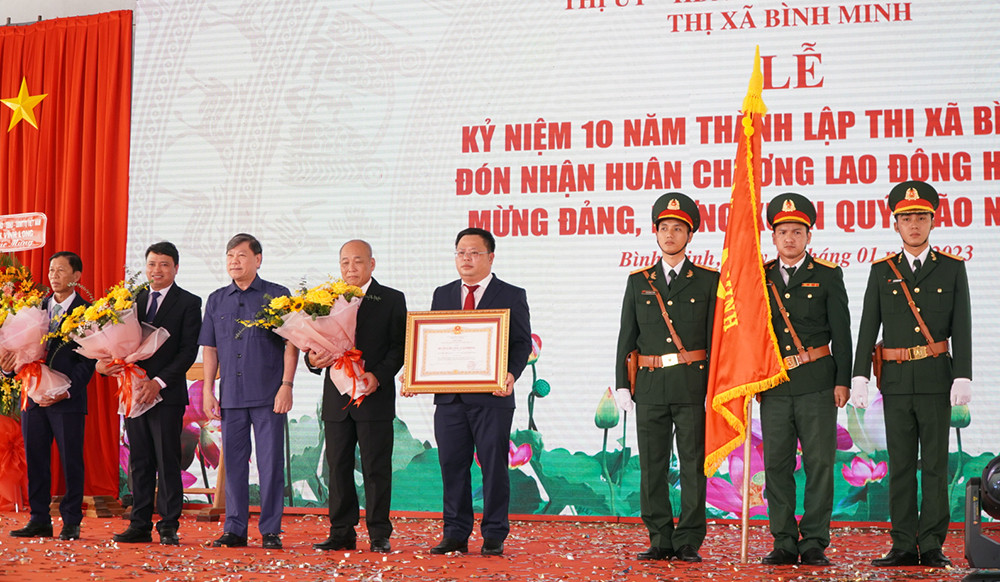 “Với sự quyết tâm phấn đấu của cả hệ thống chính trị, năm 2017 thị xã Bình Minh được Thủ tướng Chính phủ công nhận đơn vị hoàn thành nhiệm vụ xây dựng nông thôn mới, là đơn vị đầu tiên của tỉnh và đón nhận huân chương lao động hạng III. Năm 2020, thị xã Bình Minh được công nhận là đô thị loại III và hôm nay vinh sự đón nhận Huân chương Lao động hạng Nhất vì đã có thành tích xuất sắc trong công tác từ năm 2017 - 2021, góp phần vào sự nghiệp xây dựng chủ nghĩa xã hội và bảo vệ Tổ quốc”, ông Trương Đặng Vĩnh Phúc phát biểu.