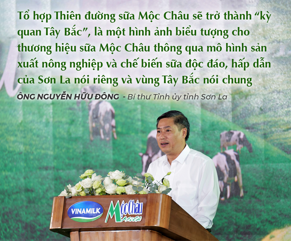 Đại diện tỉnh Sơn La, ông Nguyễn Hữu Đông - Bí thư Tỉnh ủy cũng bày tỏ sự tin tưởng: “Tổ hợp Thiên đường sữa Mộc Châu sẽ trở thành “kỳ quan Tây Bắc”, là một hình ảnh biểu tượng cho thương hiệu sữa Mộc Châu thông qua mô hình sản xuất nông nghiệp và chế biến sữa độc đáo, hấp dẫn của Sơn La nói riêng và vùng Tây Bắc nói chung. Không chỉ mang đến bước phát triển mới cho ngành chăn nuôi bò sữa và công nghiệp chế biến sữa tại Mộc Châu mà dự án còn góp phần thúc đẩy sự phát triển của kinh tế, du lịch, khai thác tối đa tiềm năng, lợi thế của địa phương, với mục tiêu xây dựng Sơn La phát triển xanh, nhanh và bền vững.”