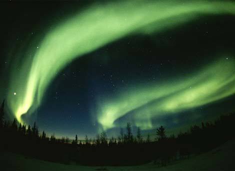 Cực quang màu xanh lục tuyệt đẹp xuất hiện trên bầu trời gần Yellowknife thuộc vùng Northwest Territories, Canada. Hiện tượng này xuất hiện khi gió mặt trời mang điện chạm vào bầu khí quyển, bị từ trường đẩy về hai cực trái đất. Các hạt mang điện phản ứng với các ion trong khí quyển, tạo thành những cuộc trình diễn ánh sáng hoành tráng.