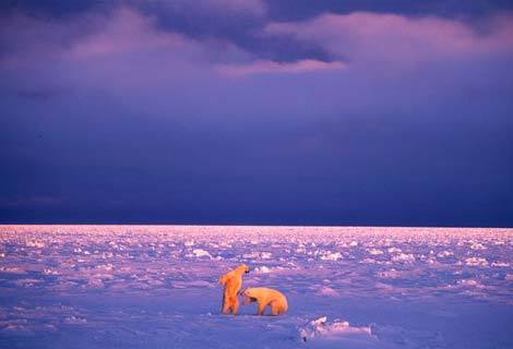 Tím là màu linh hoạt. Là sự kết hợp giữa sức thiêu đốt của màu đỏ với vẻ thanh bình của màu xanh lam, nó vừa có khả năng làm dịu vừa kích thích niềm đam mê. Màu tím cũng khá phổ biến trong tự nhiên, từ cà tím tới thạch anh tím. Và con người đã coi nó như một biểu tượng của hoàng gia. Trong ảnh, 2 chú gấu Bắc cực đang đụng độ nhau trong ánh hoàng hôn nhuộm tím cả một vùng tuyết phủ rộng lớn tại Churchill, Manitoba, thuộc Canada. Các nhà khoa học lo ngại rằng, sự biến đổi khí hậu có thể đang đe dọa đến việc sinh tồn của loài gấu quý này.