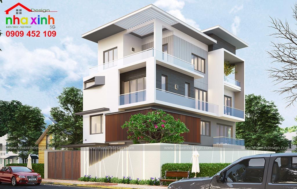 Ngôi nhà đúng với thiết kế đơn giản và hiện đại, nhấn mạnh vào các đường thẳng song song và các đường kẻ ngang tạo nên sự thu hút và ấn tượng về mặt kiến trúc. Để tạo thêm chiều sâu cho công trình, các kiến trúc sư Nhà Xinh đã sử dụng một cách tinh tế các lớp kiến trúc để tạo nên nét hiện đại và ấn tượng cho công trình. Các ban công được thiết kế khá rộng, trong đó góc tầng 3 dành để trồng cây cảnh và tạo các góc view ấn tượng. Hệ thống mái bằng mang đến sự tinh tế, nhẹ nhàng nhưng đồng thời cũng thể hiện kiến trúc không quá phô trương.
