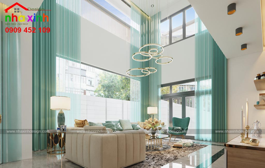 Điểm nhấn không thể bỏ qua trong thiết kế biệt thự quận 2 của Nhà Xinh chính là phòng khách tinh tế, sang trọng, thể hiện phong cách của chủ nhân với đi văng màu xanh ngọc bích và kem sữa. Ghế sofa mô-đun màu xanh và màu kem sang trọng được bố trí ở trung tâm của căn phòng, phục vụ nhiều hướng. Một tấm thảm lông lớn màu xám tạo nên một hòn đảo kết cấu mềm mại bên dưới nó. Cách đó 1m, một bàn cà phê độc đáo phô diễn điểm nhấn bằng đồng sáng bóng.