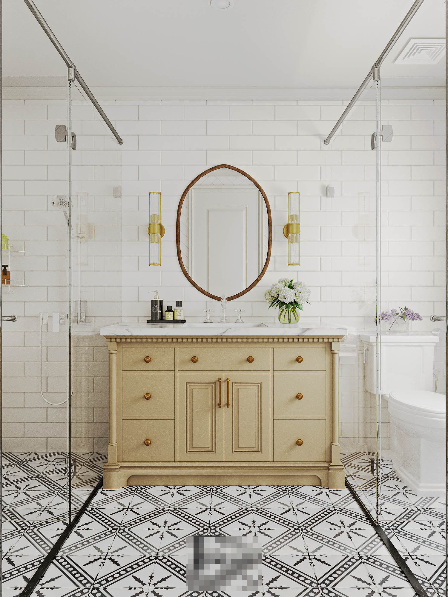 Phòng vệ sinh cổ điển, thanh lịch cũng có nhiều ánh sáng và gió mát.