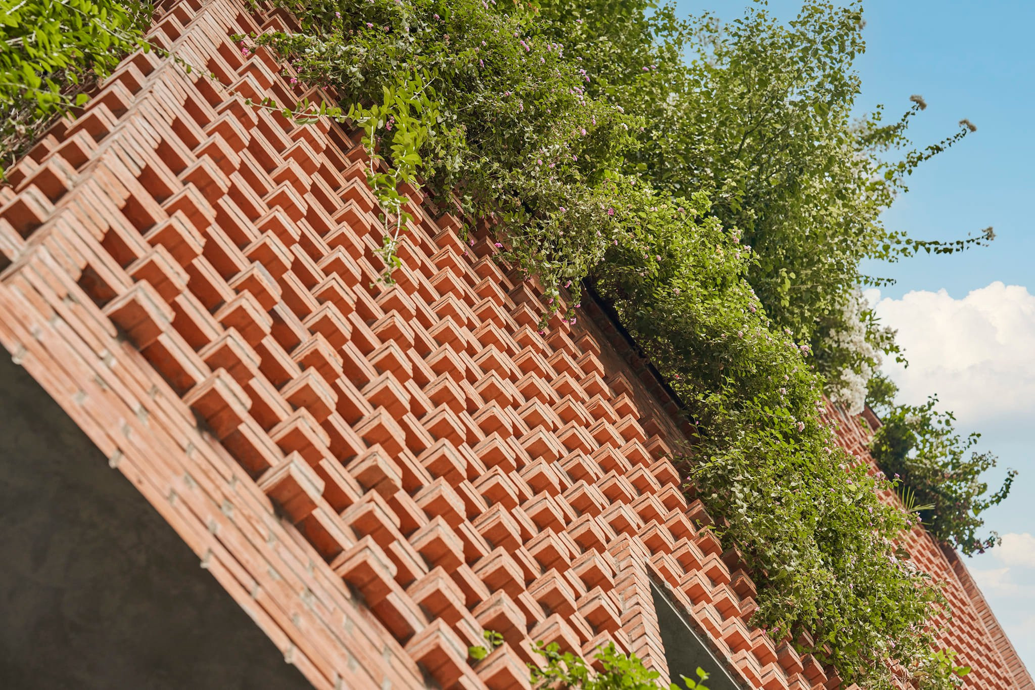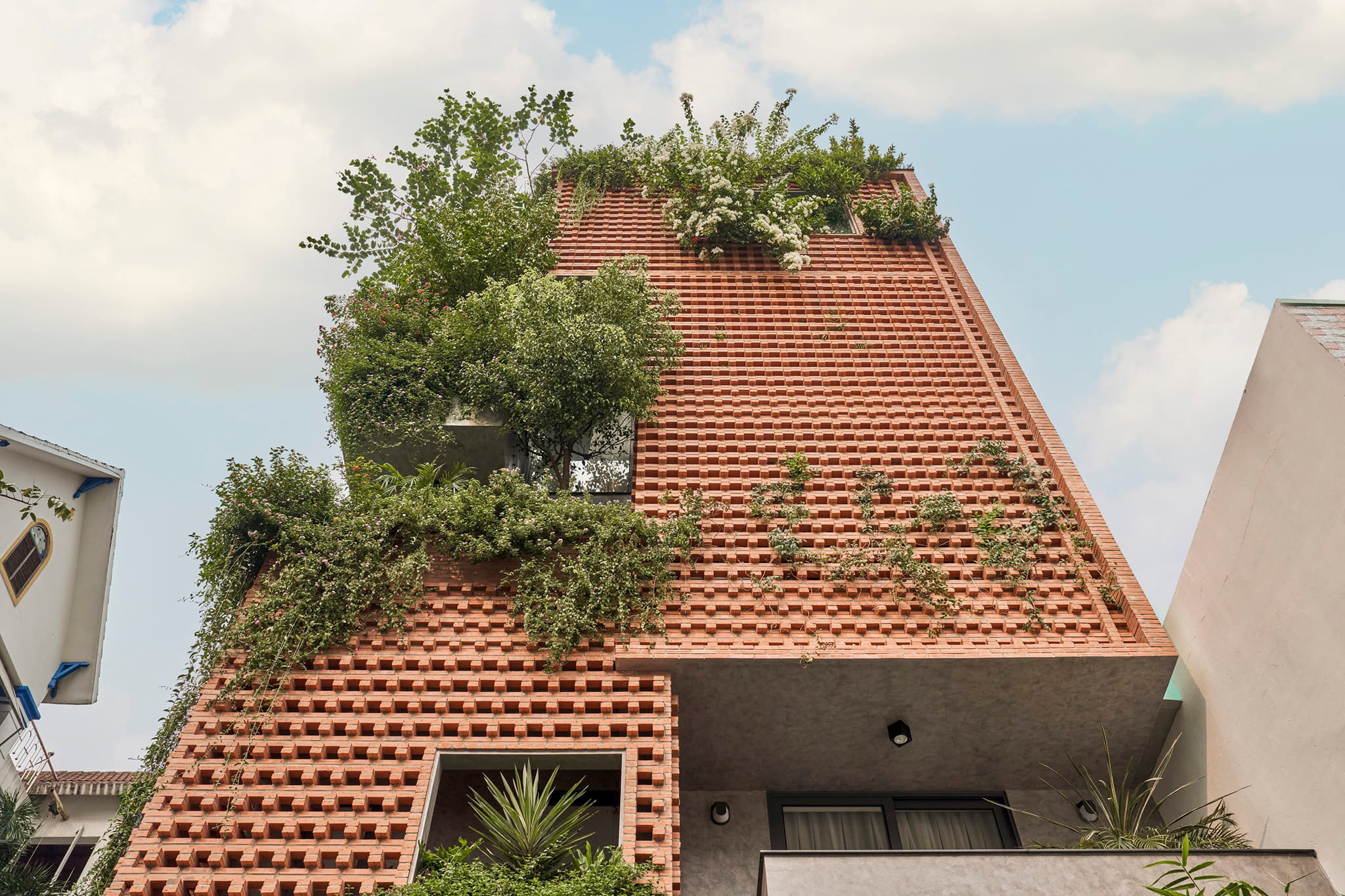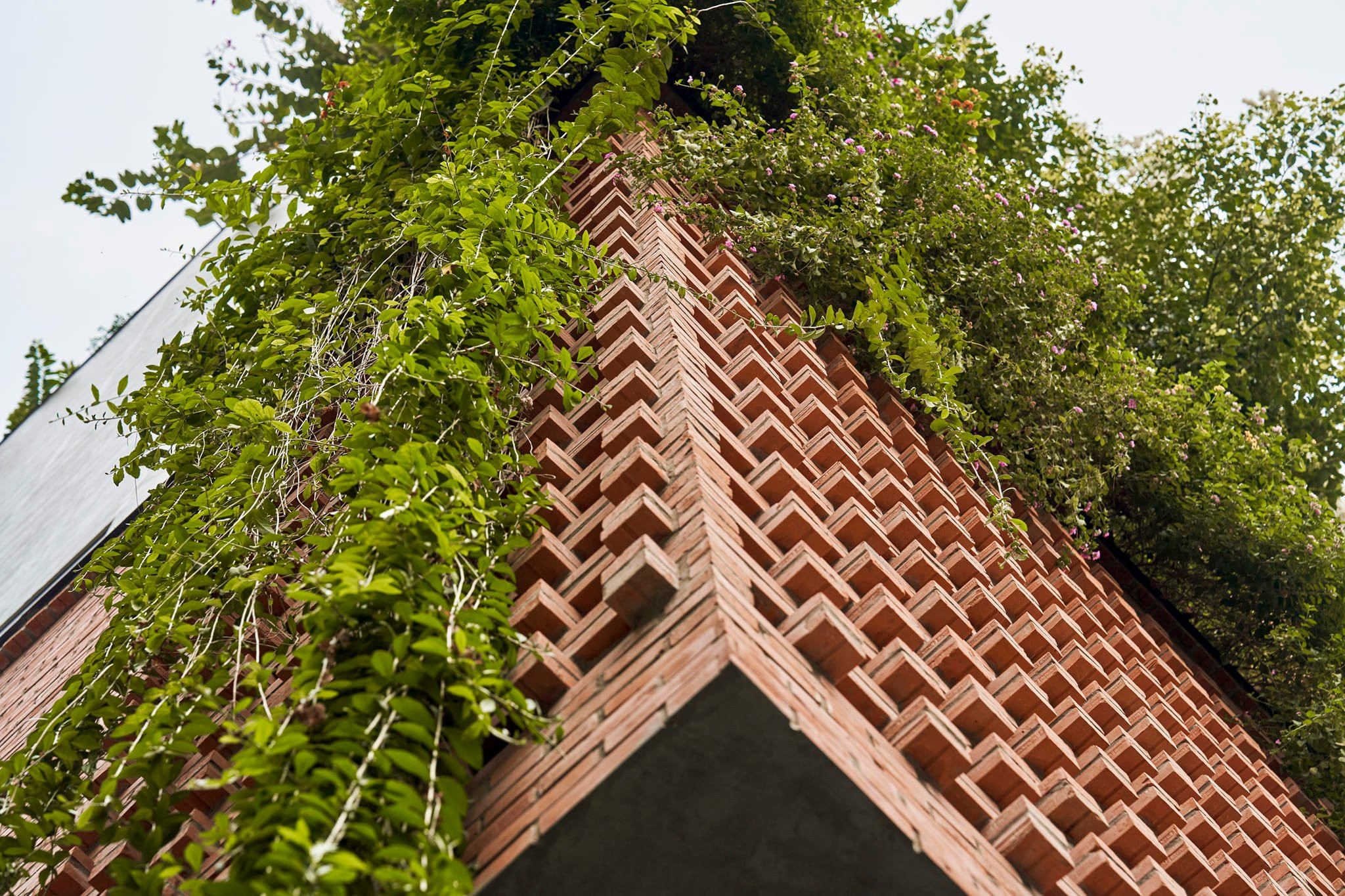 Từng viên gạch được xây tỉ mẩn. Nhìn từ ngoài vào, ta cảm giác đây là tổ ong lớn. Hệ cây xanh bung ra từ ban công và mái nhà tạo nên mặt tiền đầy thú vị.