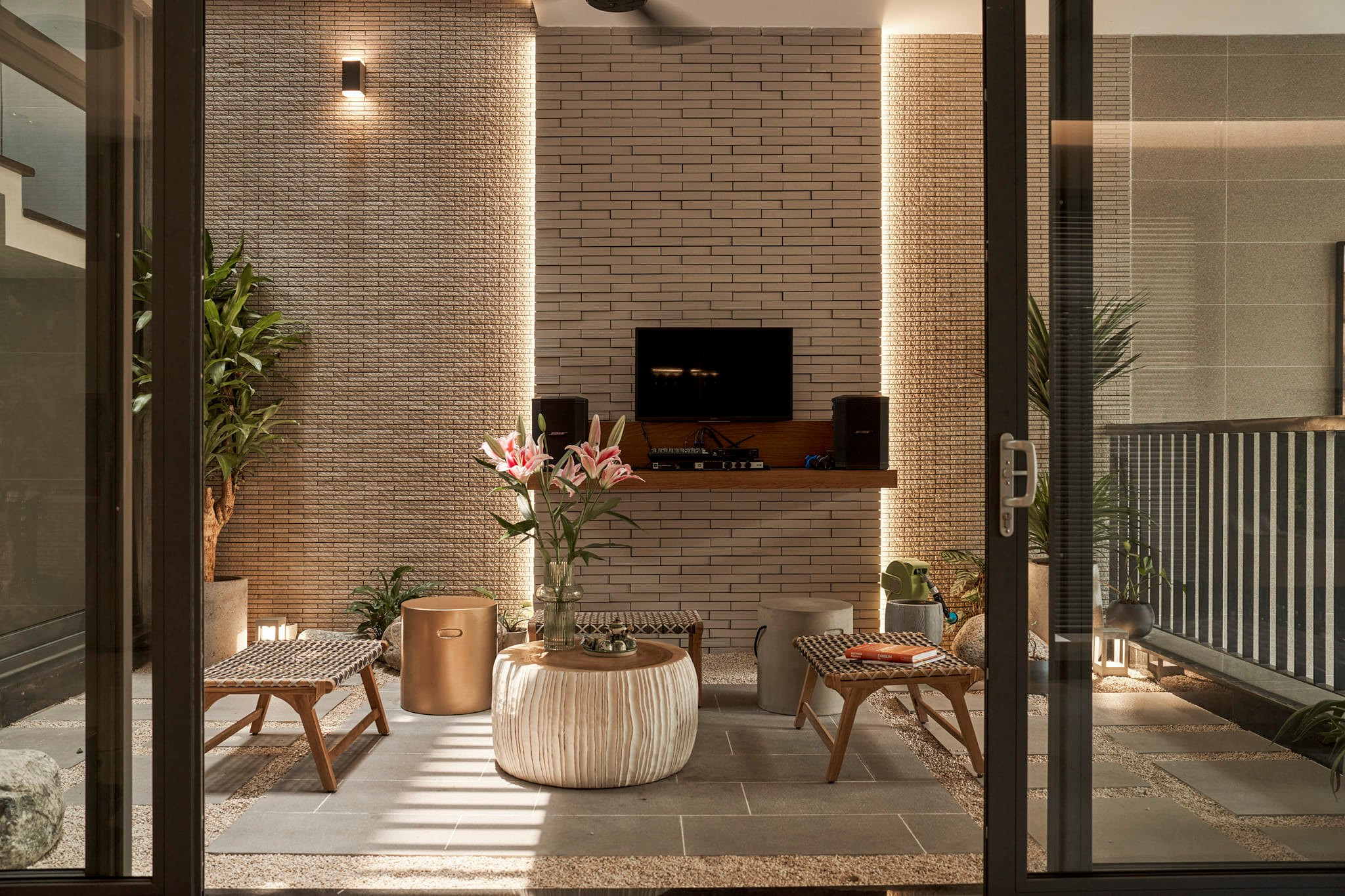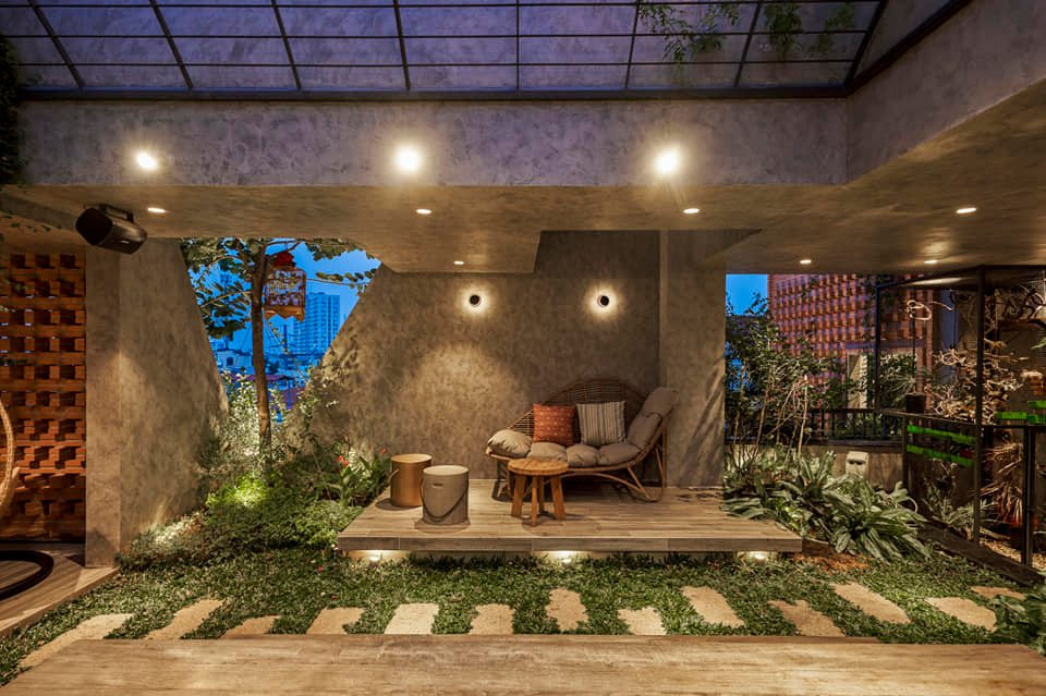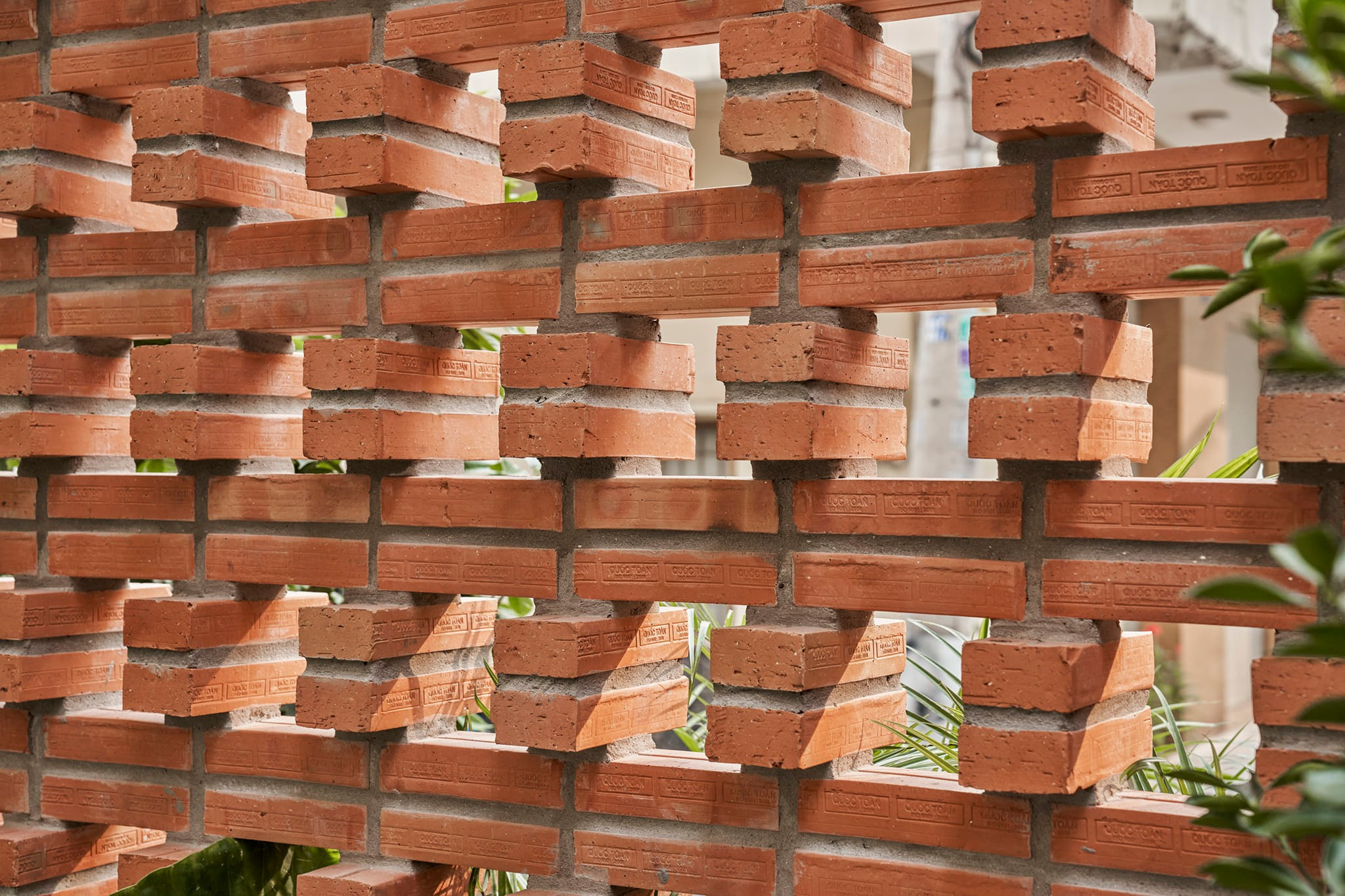Từng viên gạch được xây tỉ mẩn. Nhìn từ ngoài vào, ta cảm giác đây là tổ ong lớn. Hệ cây xanh bung ra từ ban công và mái nhà tạo nên mặt tiền đầy thú vị.