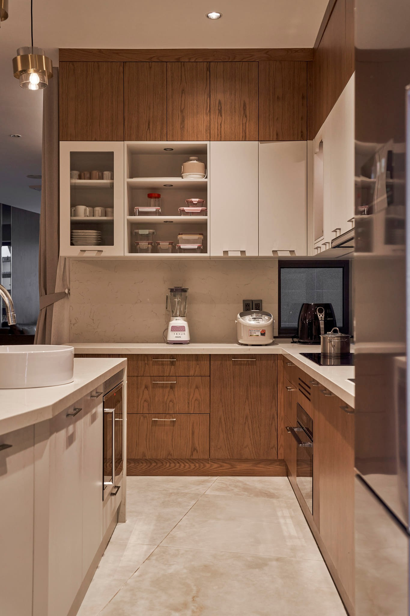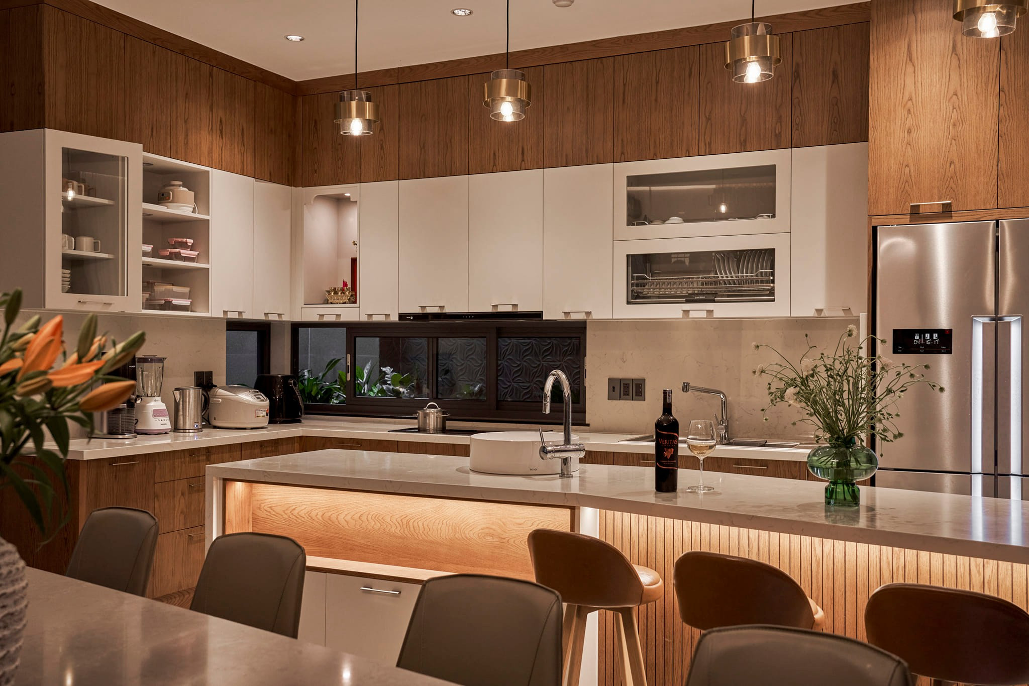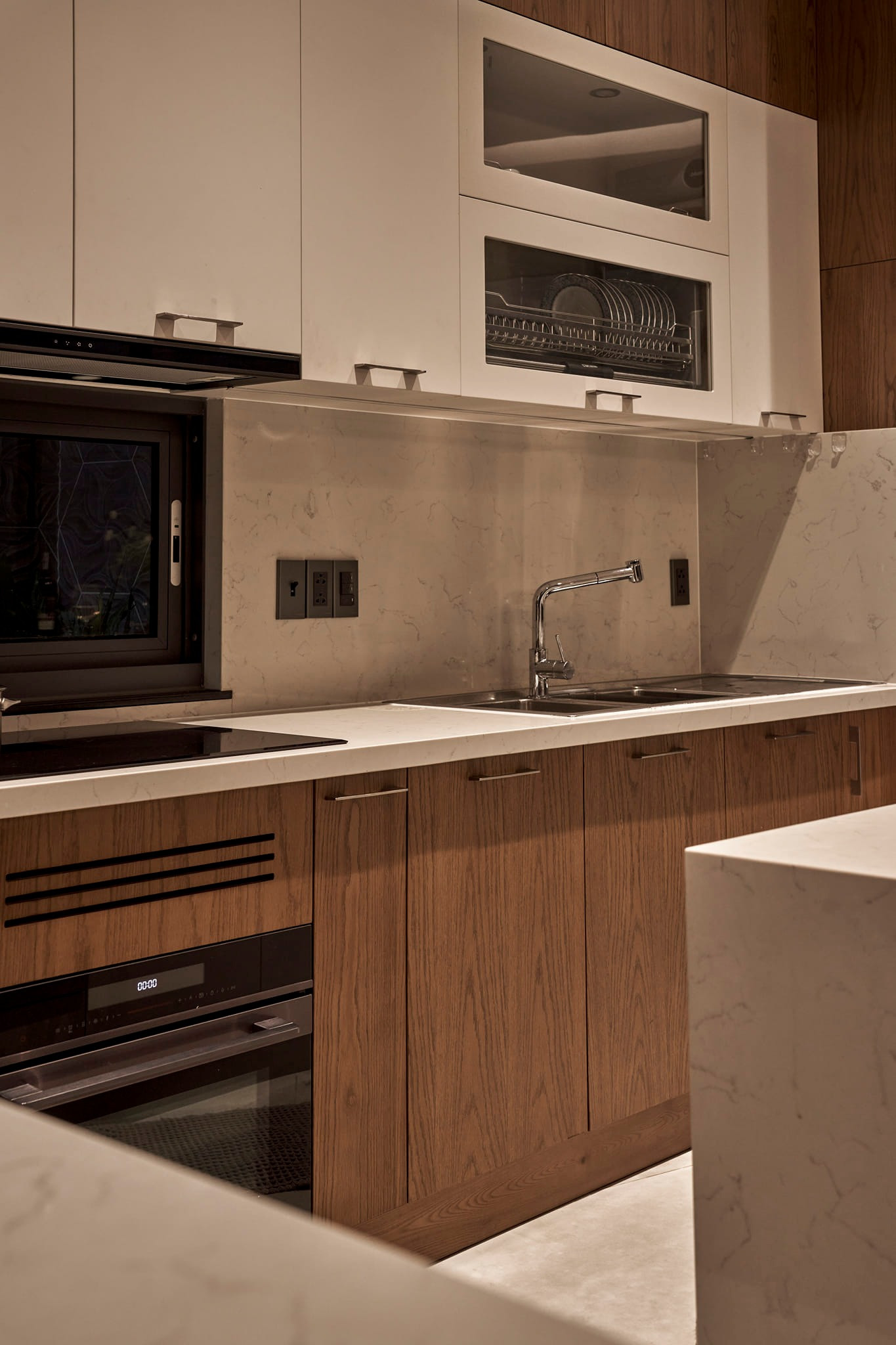 Bếp ngăn nắp, hiện đại với gam màu trắng và vàng gỗ. Phần cửa không có gờ để tiện cho việc vệ sinh, lau dọn.