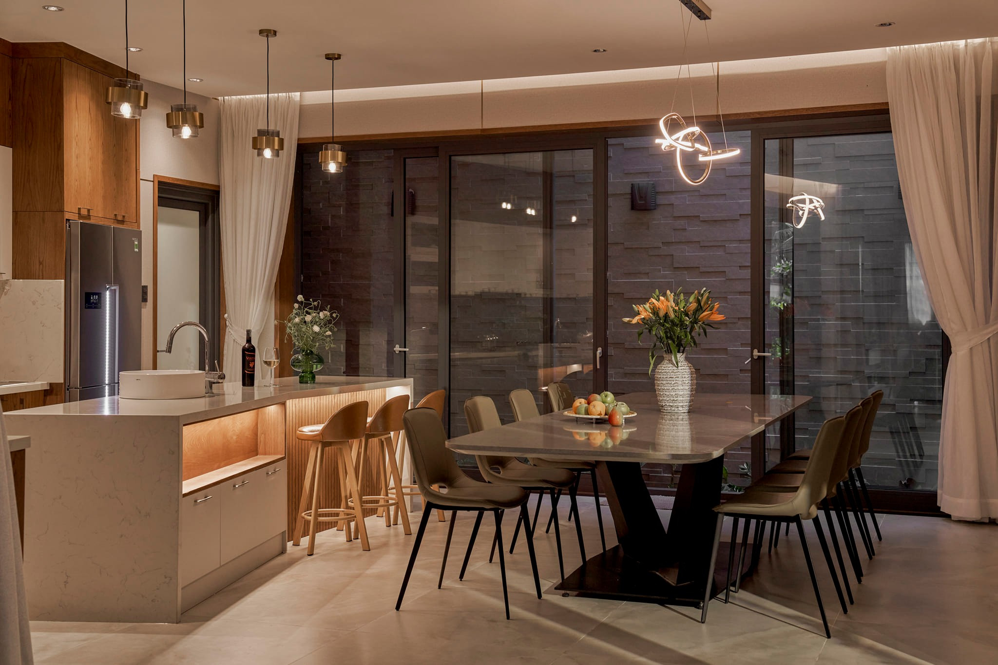 Màu sắn nội thất mang gam trầm, hài hòa với nền gạch đỏ mộc. Một thiết kế vừa mang hơi thở làng quê nhưng cũng không kém phần tiện nghi, hiện đại.