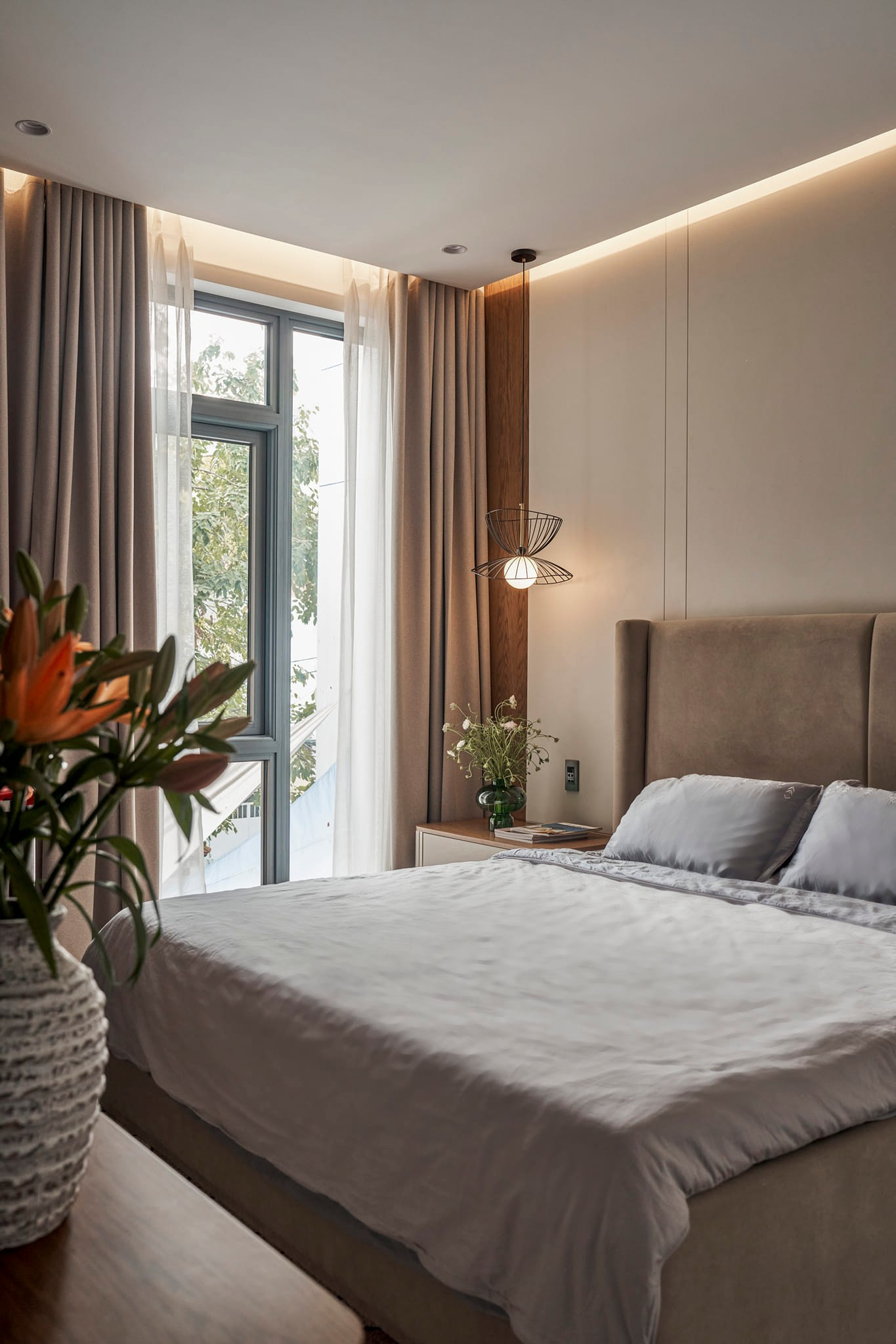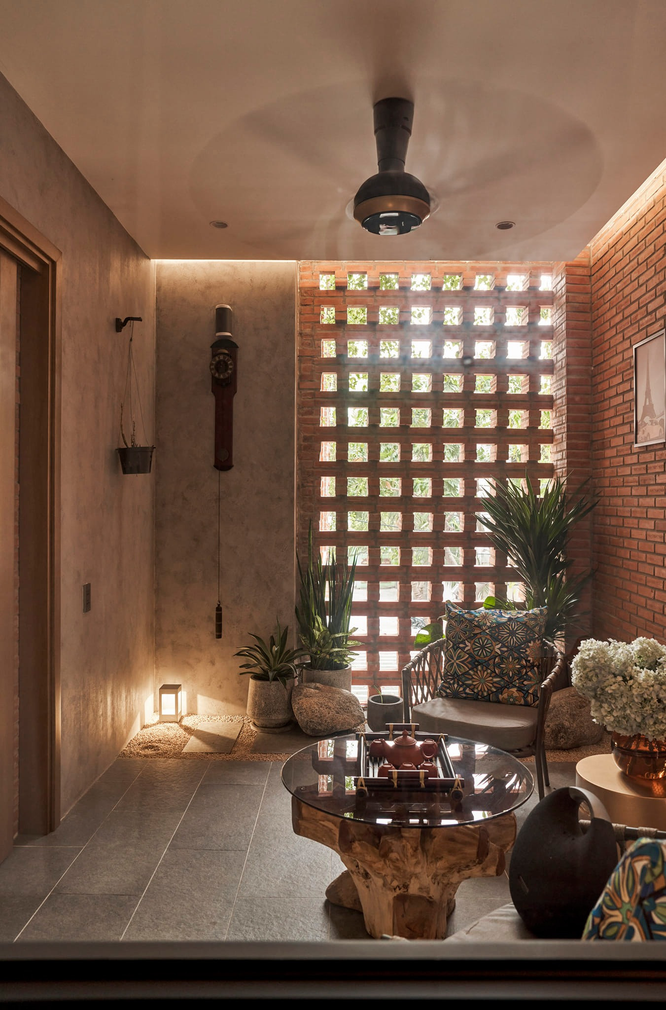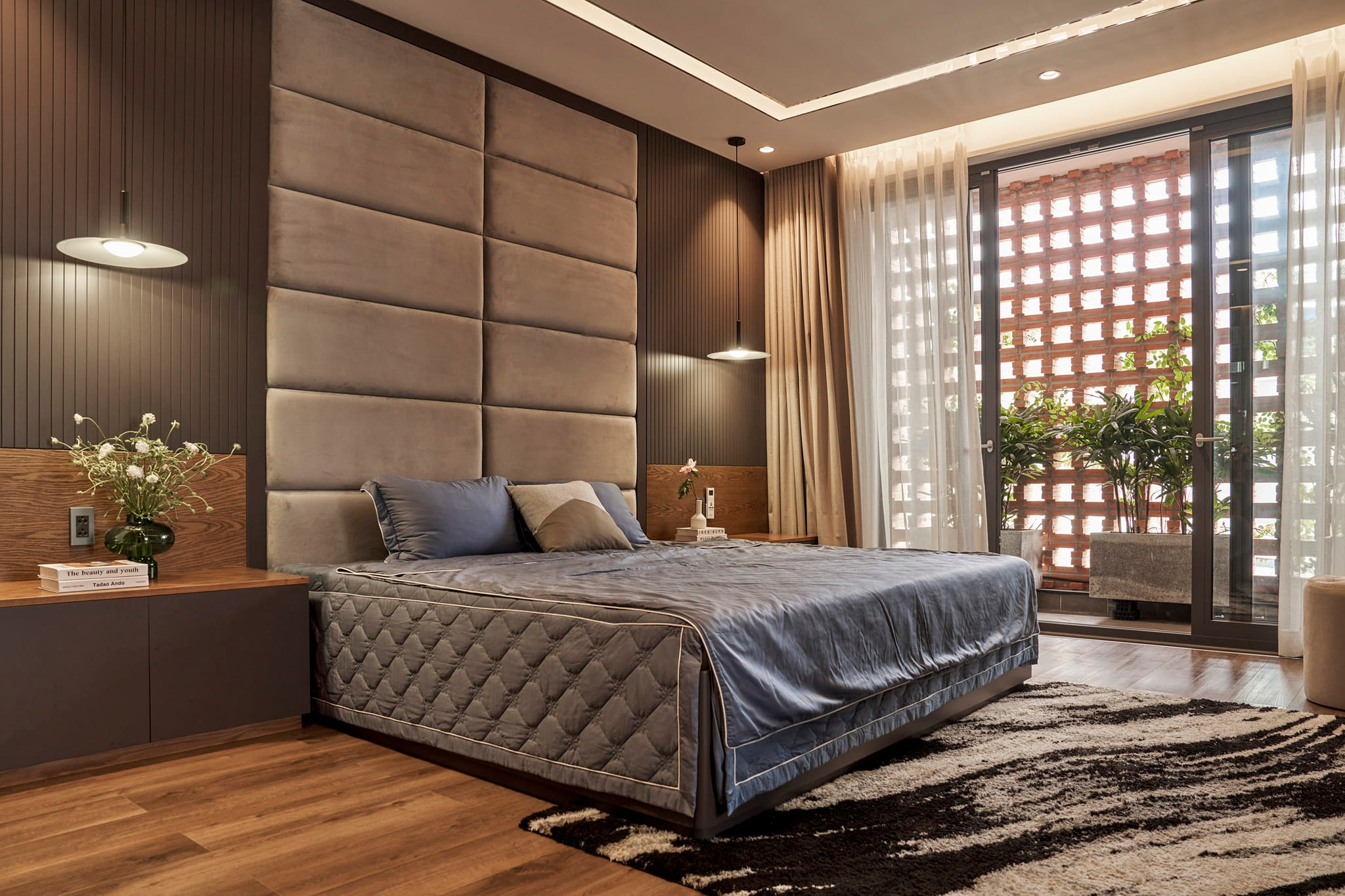 Phòng ngủ này nằm ở hướng Tây, nhờ mảng tường xây kiểu gạch lỗ nên cản được nắng mà vẫn thoáng đãng.