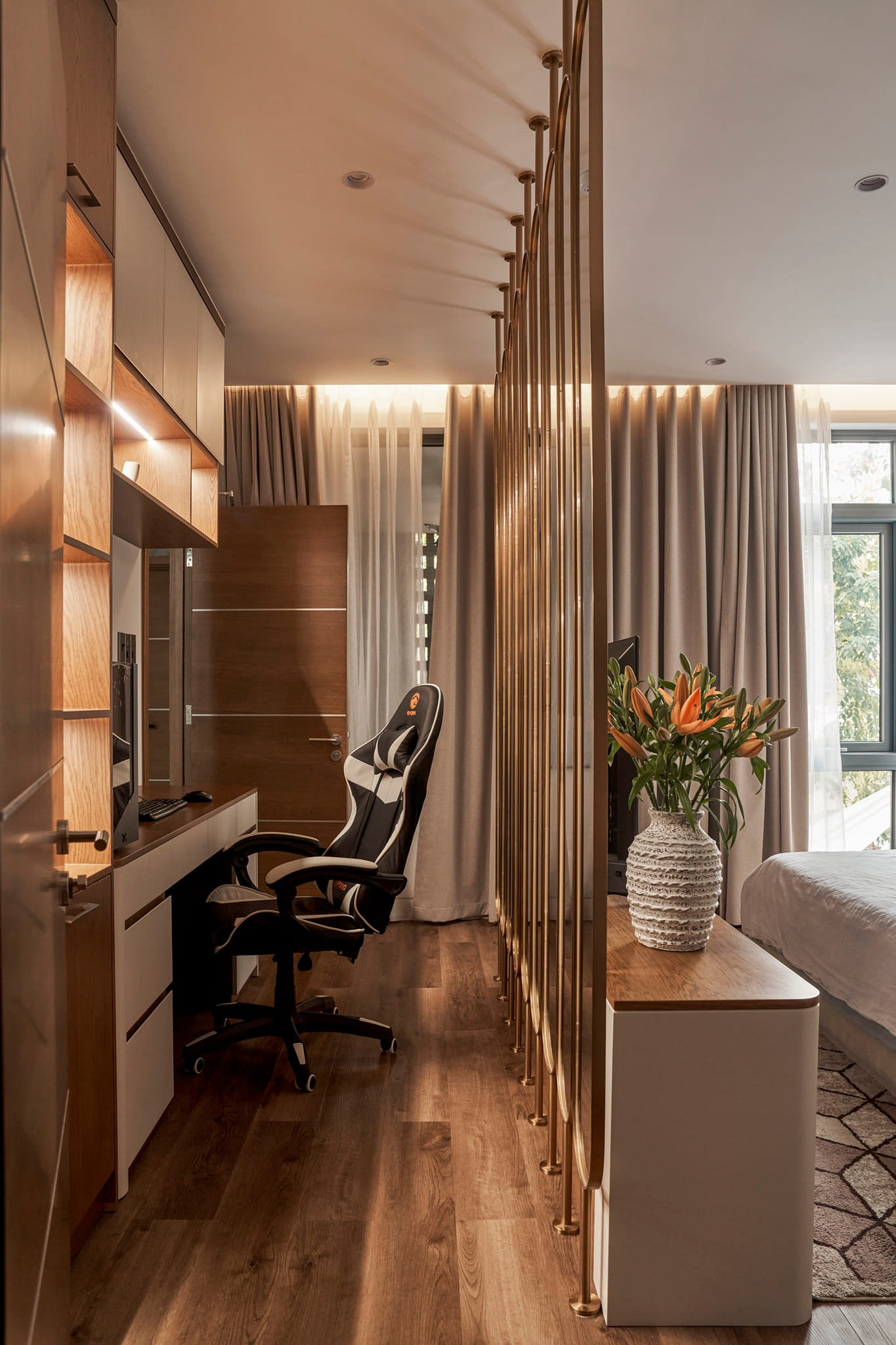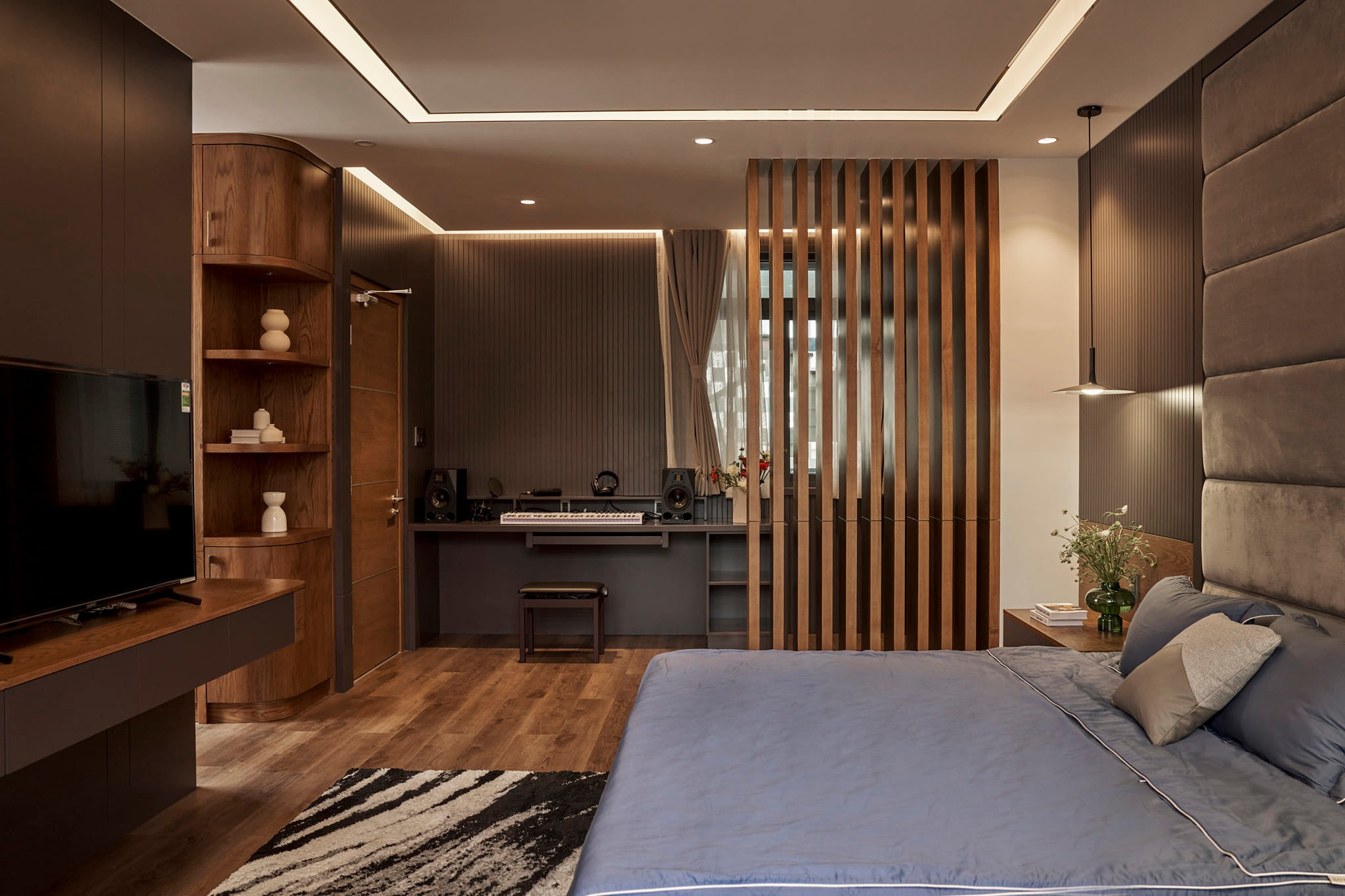 Phòng ngủ master theo lối hiện đại pha một chút vintage. Góc làm việc ngăn với giường chỉ bằng tấm bình phong mỏng những vẫn tạo ra sự riêng tư cần thiết.