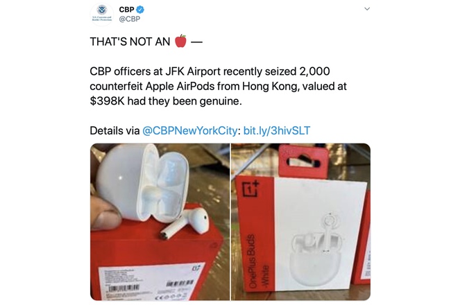 Đêm qua, Cục Hải quan và Bảo vệ Biên giới Mỹ (CBP) đăng tải dòng tweet tuyên bố các quan chức của họ "vừa bắt giữ 2.000 chiếc Apple AirPods giả từ Hong Kong, có giá trị khoảng 398.000 USD trên thị trường."