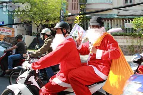 | Thay vì cưỡi tuần lộc, các ông già Noel đèo nhau bằng xe máy trong trang phục đỏ rực như thắp lửa các tuyến đường trung tâm TP HCM.(Ảnh Ione) |