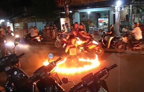 Khi không khí nhậu đang hồi hấp dẫn thì có 2 “thiếu nữ” chạy xe máy chở thêm 2 chiếc loa thùng phía sau trờ đến. Hai người này không có tài ca hát, mà chỉ có chiêu… múa lửa. Màn múa lửa theo tiếng nhạc xình xịch của “thiếu nữ” cao khoảng 1,5m không thu hút sự chú ý của thực khách vì thân hình không có điểm nhấn, hấp dẫn người xem. Màn thứ 2 mới thực sự hào hứng. “Thiếu nữ” thứ 2 cao khoảng 1,7m bất ngờ chạy ra đường rồi lột phăng chiếc áo đang mặc, để lộ đôi “bồng đảo”, trên tay cầm 2 que sắt lửa cháy hừng hực rồi… đốt lên người.