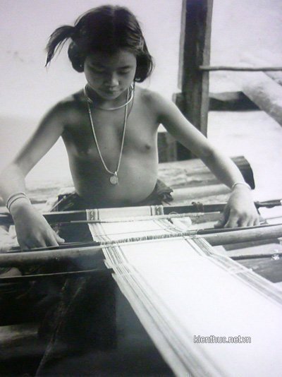 Thiếu nữ khỏa thân ngồi dệt lụa và rất tự tin trước ống kính. Cụ Phỉ cho biết,