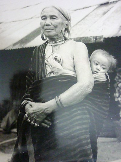 Một phụ nữ địu con (cháu) trên lưng được cụ Phỉ chụp tại khu vực giáp ranh giữa