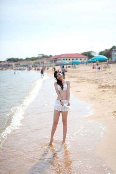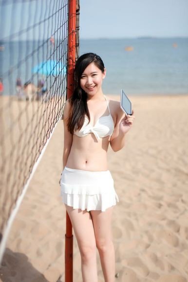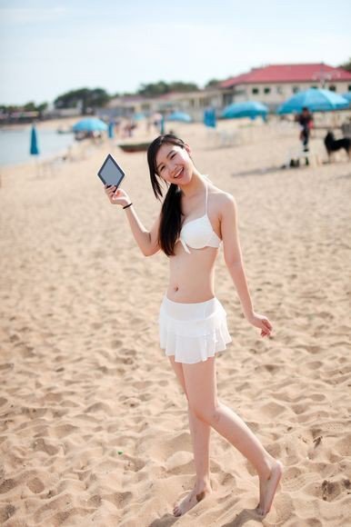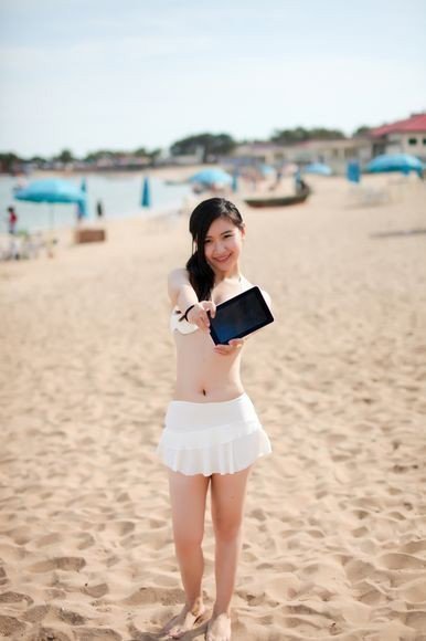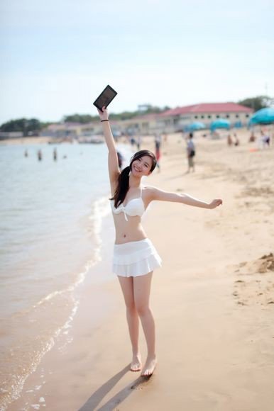 Ngắm chùm ảnh thiếu nữ xinh tươi trong bikini khoe tablet trên bờ biển.