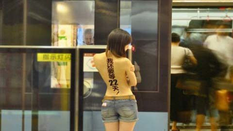 Đám đông không ngừng quay phim, chụp ảnh khi thấy một cô gái để ngực trần đứng trên ga tàu điện ngầm ở thành phố Nam Kinh (Trung Quốc).