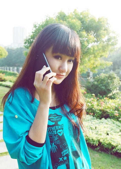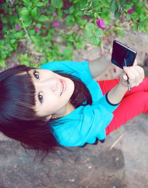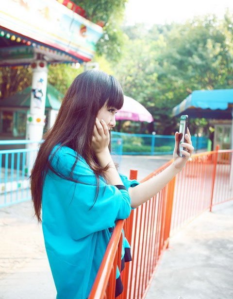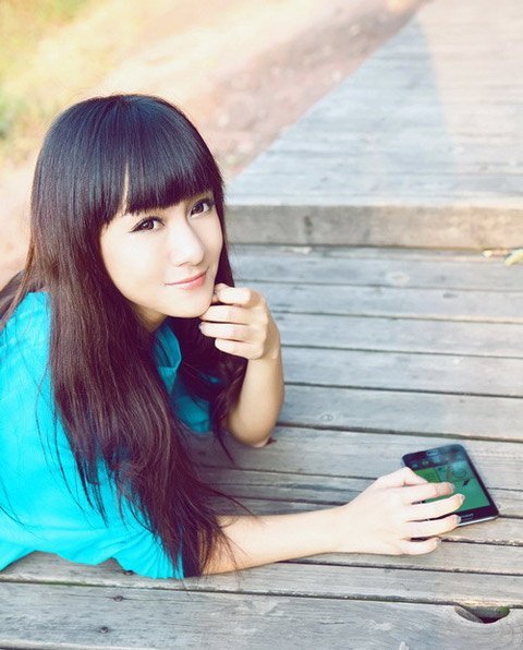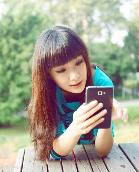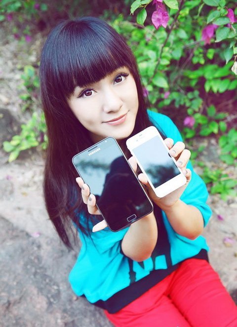 Thiếu nữ xì-tin làm dáng bên smartphone
