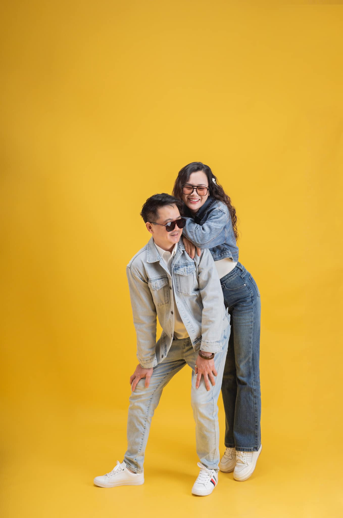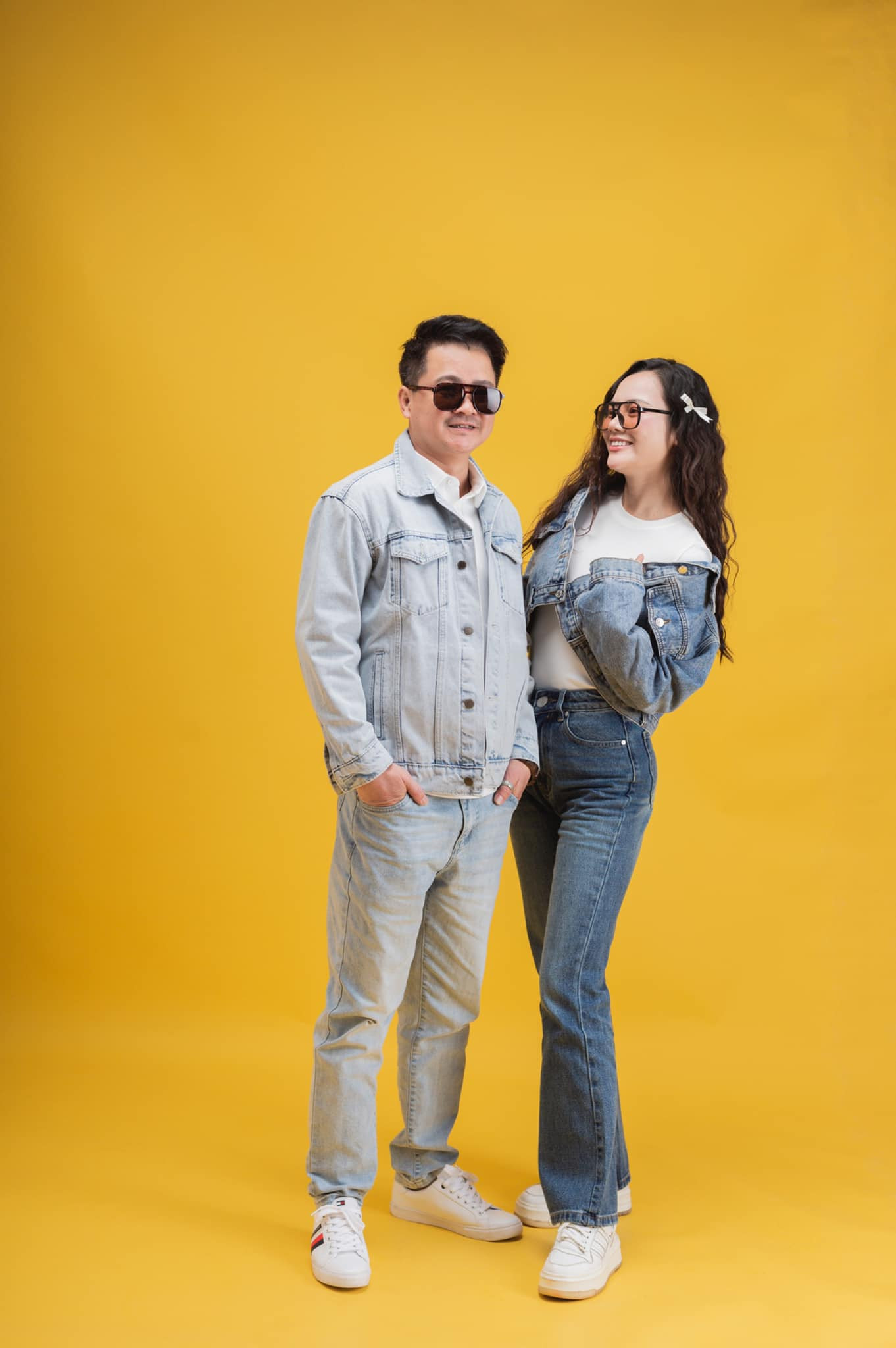 Khác với hình ảnh chỉn chu khi mặc quân phục, Huyền Sâm và Đới Quân mặc đồ trẻ trung khi thực hiện loạt ảnh kỷ niệm trong studio.