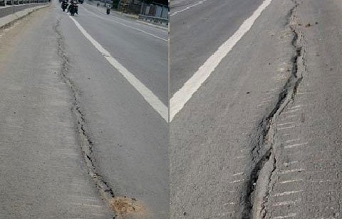 | Vết lún, nứt ở cầu Đất Sét nghìn tỷ. Ảnh: Quốc Huy |