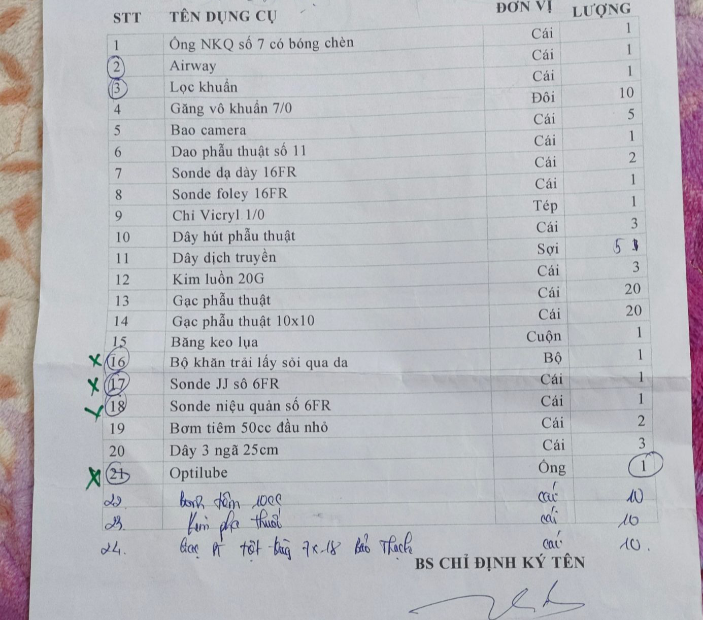 Trước phẫu thuật nội soi một ngày, nhân viên y tế đưa cho chị Lan một tờ giấy ghi danh sách 24 loại vật dụng cần mua, bao gồm dao phẫu thuật số 11, găng vô khuẩn, gạc phẫu thuật, bỗ khăn trải lấy sỏi, bơm kim tiêm, băng keo, dây dịch truyền, bao camera, ống hút phẫu thuật, sonde JJ niệu quản, ống nội khí quản… Trong đó, găng tay là 10 bộ, bơm tiêm 10 cái, kim pha thuốc 10 cái, gạc 20 cái…