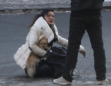 Điều khiến những người qua đường ngạc nhiên hơn đó là cô gái có gương mặt xinh xắn giấu một chú chó con dưới chiếc áo khoác của mình và cố gắng không để nó bị đau trước sự tấn công của người đàn ông.