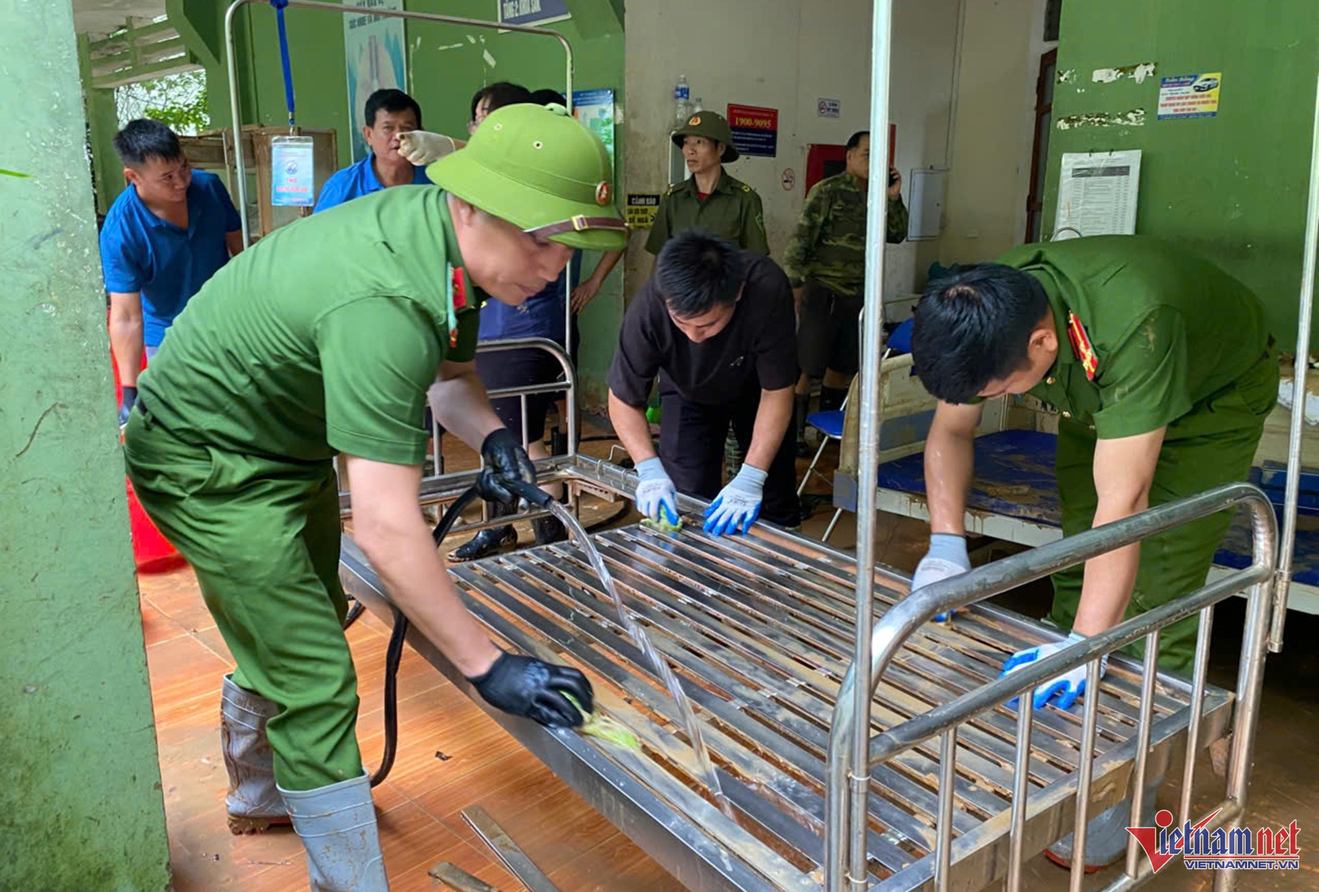 Lực lượng công an hỗ trợ cán bộ, nhân viên trung tâm y tế khắc phục hậu quả lũ lụt. Ảnh: Thanh Hải