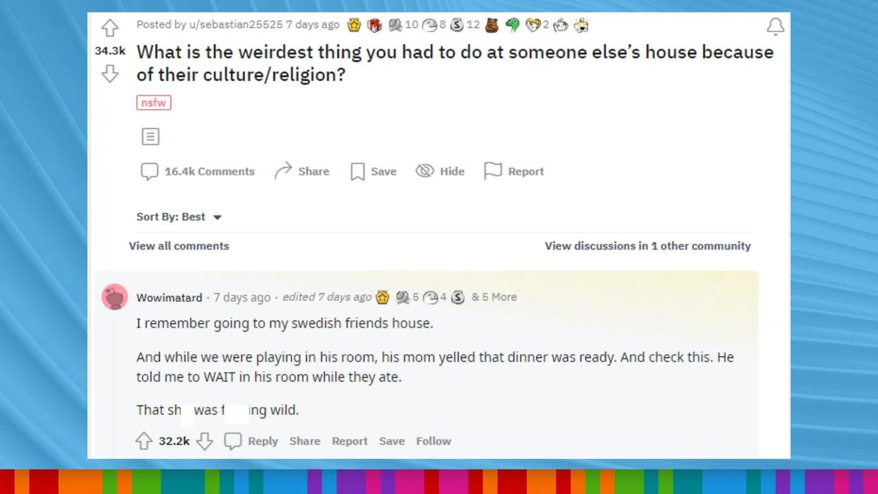 Mới đây, một bài đăng trên trang mạng Reddit với chủ đề về "Những trải nghiệm kỳ lạ nhất mà bạn có khi đến thăm nhà của những người thuộc nền văn hóa hoặc tôn giáo khác là gì?" đã thu hút được rất nhiều ý kiến. Trong đó, phần bình luận của một du khách từng có thời gian tới thăm Thụy Điển đã tiết lộ trải nghiệm khiến nhiều người "ngã ngửa" vì bất ngờ.