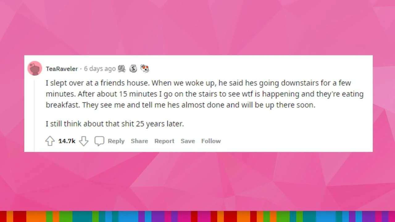 "Tôi ngủ quên ở nhà một người bạn. Sau đấy, khi chúng tôi thức dậy, anh ấy bảo rằng có việc xuống dưới nhà vài phút. Khoảng 15 phút sau, tôi ra cầu thang xem có chuyện gì thì thấy mọi người dưới đó đang ngồi ăn sáng. Anh bạn trông thấy tôi và bảo rằng sắp ăn xong rồi sẽ lên phòng sớm thôi. Sau 25 năm, tôi vẫn không thể quên được chuyện này", một người khác viết.