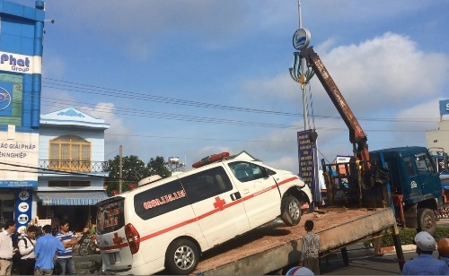 Xe cứu thương bật còi hụ ưu tiên qua ngã tư, trên xe chở bệnh nhân đang hấp hối 84 tuổi cùng người nhà về Bình Phước thì bị xe ô tô 4 chỗ “chặn đường”. Hậu quả, xe 4 chỗ bị húc nát đầu, xe cấp cứu nổ lốp lao về phía trước hàng chục mét.