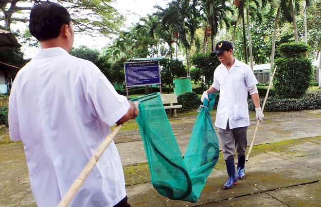Để chăm sóc, chữa trị vết thương cho con rắn hổ mang chúa từng bị dân khâu miệng, các chuyên gia phải sát trùng vết thương và đút thức ăn đến tận miệng.