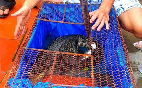 Con sấu khoảng 5 kg của anh Nguyễn Thanh Tùng, 42 tuổi, ngụ ấp Tắc Thủ, xã Hồ Thị Kỷ (Thới Bình, Cà Mau) phát ra tiếng kêu như chó sủa.