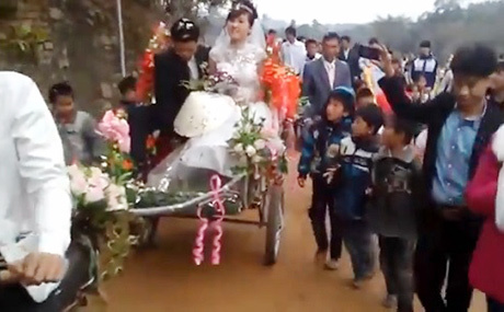 ![]() Thú vị clip đám rước dâu bằng xe cải tiến ở Nghệ An Cô dâu chú rể ngồi trên bằng xe cải tiến trang trí hoa được kéo đi bằng một chiếc xe máy trong khi trẻ con háo hức chạy theo xem. |