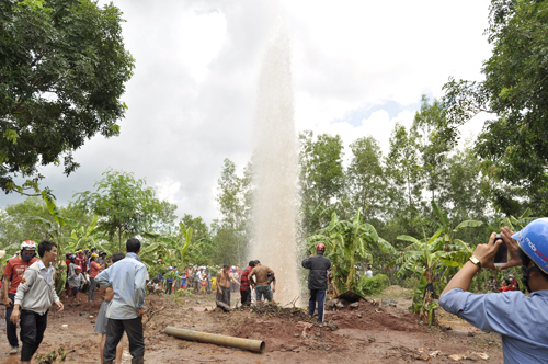 Hình ảnh giếng khoan tự phun hàng chục mét trên rẫy của gia đình ông Nguyễn Văn Bảnh (trên địa bàn xã Đá Bạc, huyện Châu Đức, Vũng Tàu).
