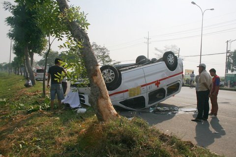 Vừa đổ dốc cầu Cần Giuộc (xã Phong Phú, H. Bình Chánh, TP.HCM) một xe cứu thương trên đường chuyển bệnh nhân về đã đâm vào gốc cây ven đường lật ngửa.