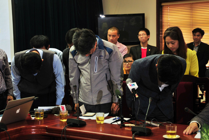 Trước khi trả lời những câu hỏi của báo chí truy vấn trách nhiệm vụ sập giàn giáo, ông Thái Chi Pháp, Trưởng đại diện Formosa tại Hà Tĩnh cùng đồng sự đã cúi đầu tạ lỗi người dân Việt Nam, bày tỏ thái độ ‘đau lòng’ về vụ việc.