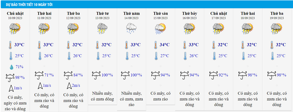 Dự báo thời tiết Hà Nội 10 ngày (10-19/9). Ảnh: NCHMF