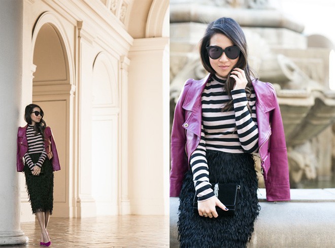 Màu hồng cánh sen kết hợp chất liệu lông đen sẫm mang lại vẻ đẹp thanh lịch, khác lạ cho fashionista nổi tiếng bậc nhất San Fransisco. |