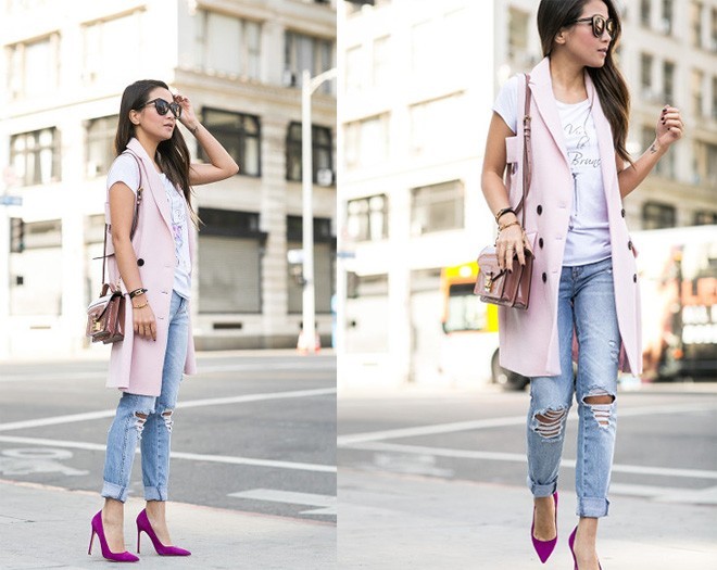 Jeans rách giúp set đồ hồng không những chẳng sến sẩm mà còn rất phong cách và cuốn hút. |