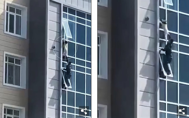 Sabit Shontakbaev, 37 tuổi đang trên đường đi làm cùng bạn thì thấy một đám đông nhìn chằm chằm lên phía trên - nơi có một bé gái 3 tuổi đang treo mình trên cửa sổ tầng 8.