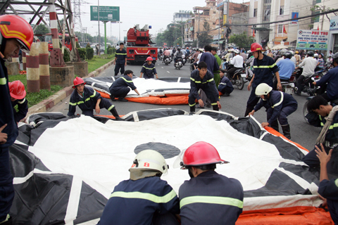 hộ căng nệm hơi đề phòng nam thanh niên nhảy xuống (Ảnh An Nhơn)