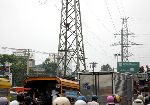 trụ điện. Trong khi đó, nam thanh niên la hét và tiếp tục đu trên dây điện