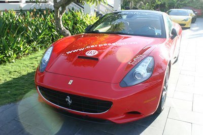 Siêu xe Ferrari California (giữa) của Dương "Kon" cùng đoàn siêu xe Hà Nội khuấy động đảo Tuần Châu đầu năm 2011.