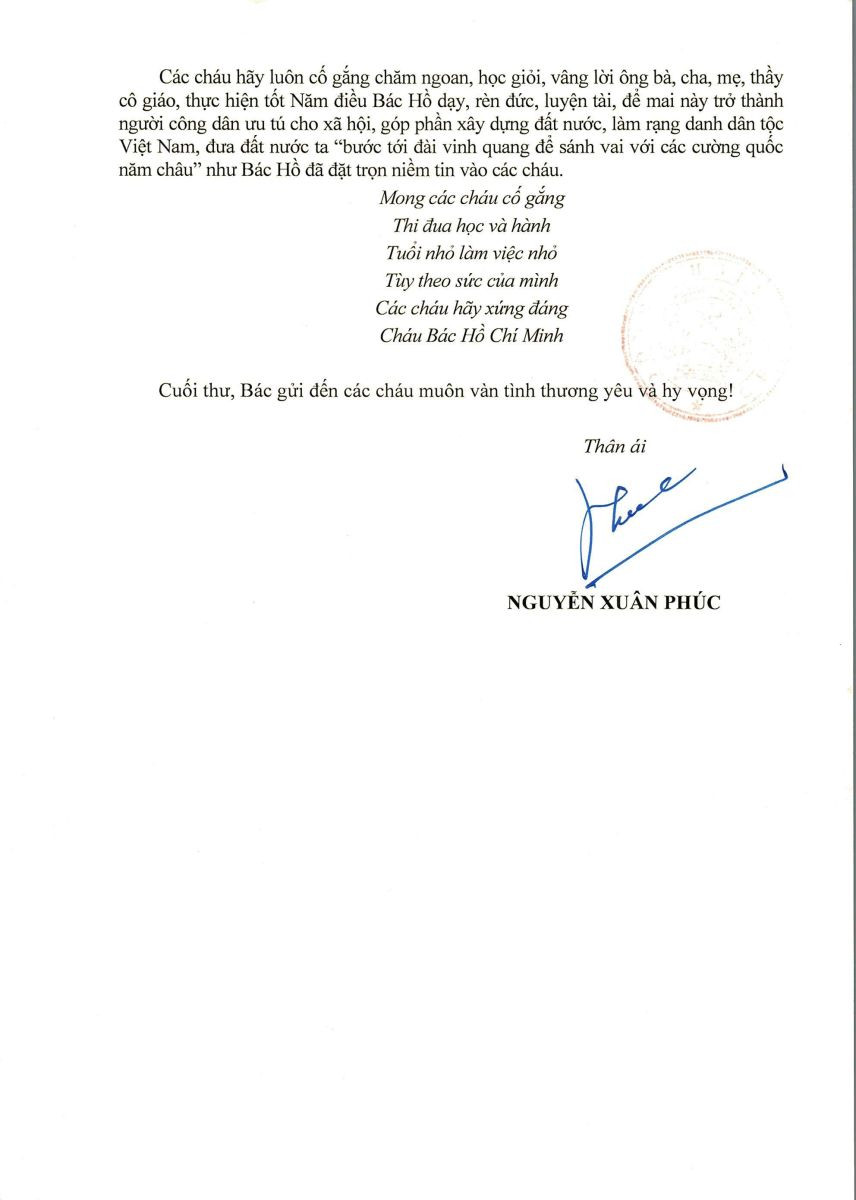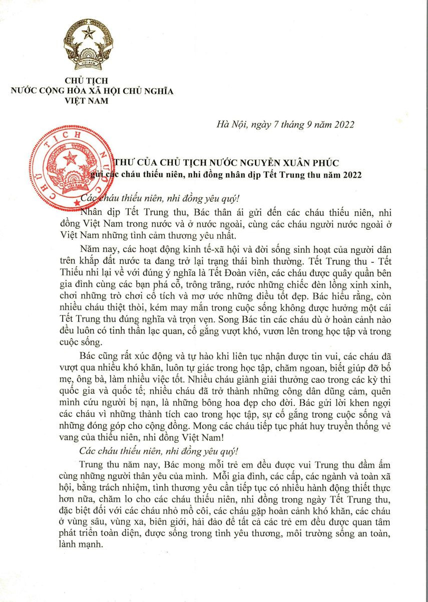 Nhân dịp Tết Trung thu năm 2022, Chủ tịch nước Nguyễn Xuân Phúc đã có Thư gửi các cháu thiếu niên, nhi đồng.