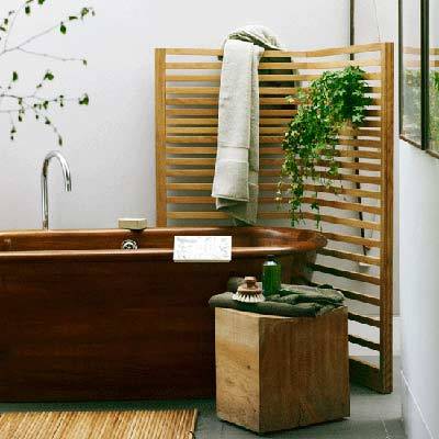 những chất liệu tự nhiên để trang trí như đá ốp tường, bồn tắm gỗ, ốp vách bằng