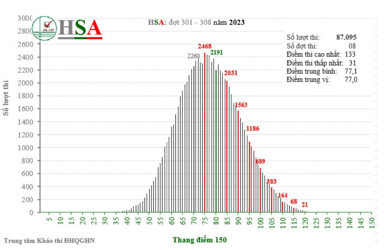 Chia sẻ với VietNamNet chiều 12/6, GS Nguyễn Tiến Thảo, Giám đốc Trung tâm Khảo thí ĐH Quốc gia Hà Nội cho biết, theo thống kê kết quả kỳ thi Đánh giá năng lực của ĐH Quốc gia Hà Nội năm 2023, thí sinh có điểm cao nhất đạt 133/150; thấp nhất là 31/150.