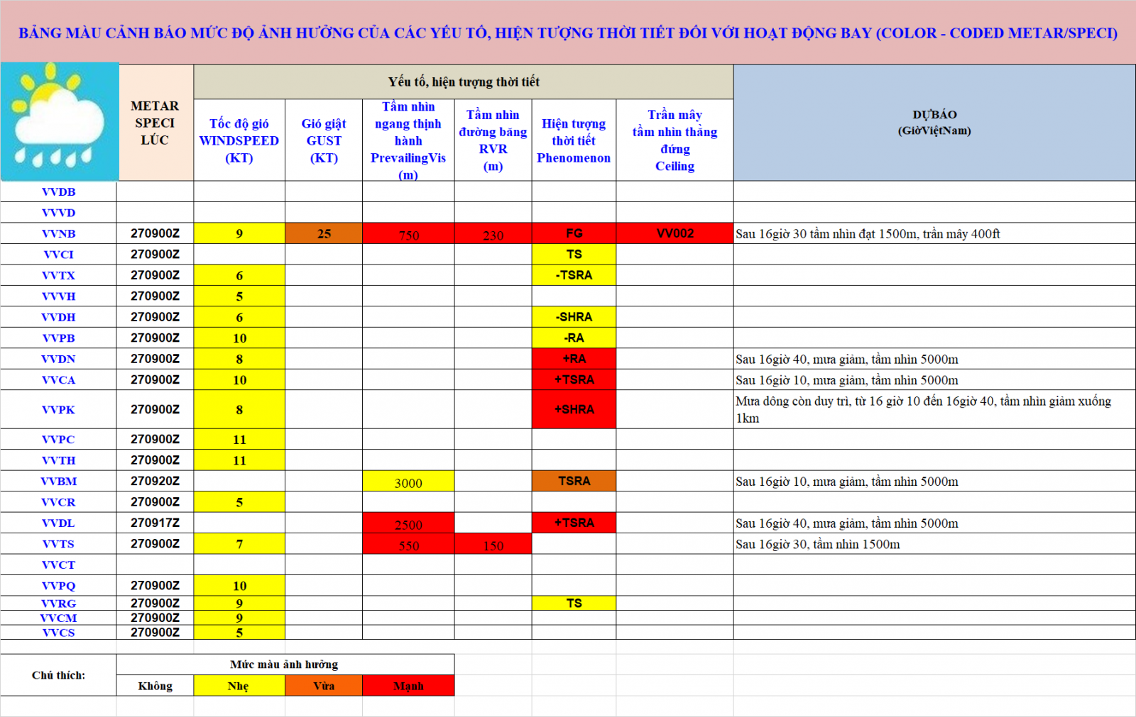 Khi các yếu tố khí tượng, hiện tượng thời tiết nguy hiểm được dự báo xuất hiện với cường độ vừa hoặc mạnh, hoặc từ cường độ vừa sang mạnh và ngược lại, hoặc từ mạnh và vừa được dự báo kết thúc, các dự báo viên sẽ cung cấp bảng cảnh báo kèm màu cường độ lên nhóm Viber “Phối hợp điều hành bay khi thời tiết xấu”.